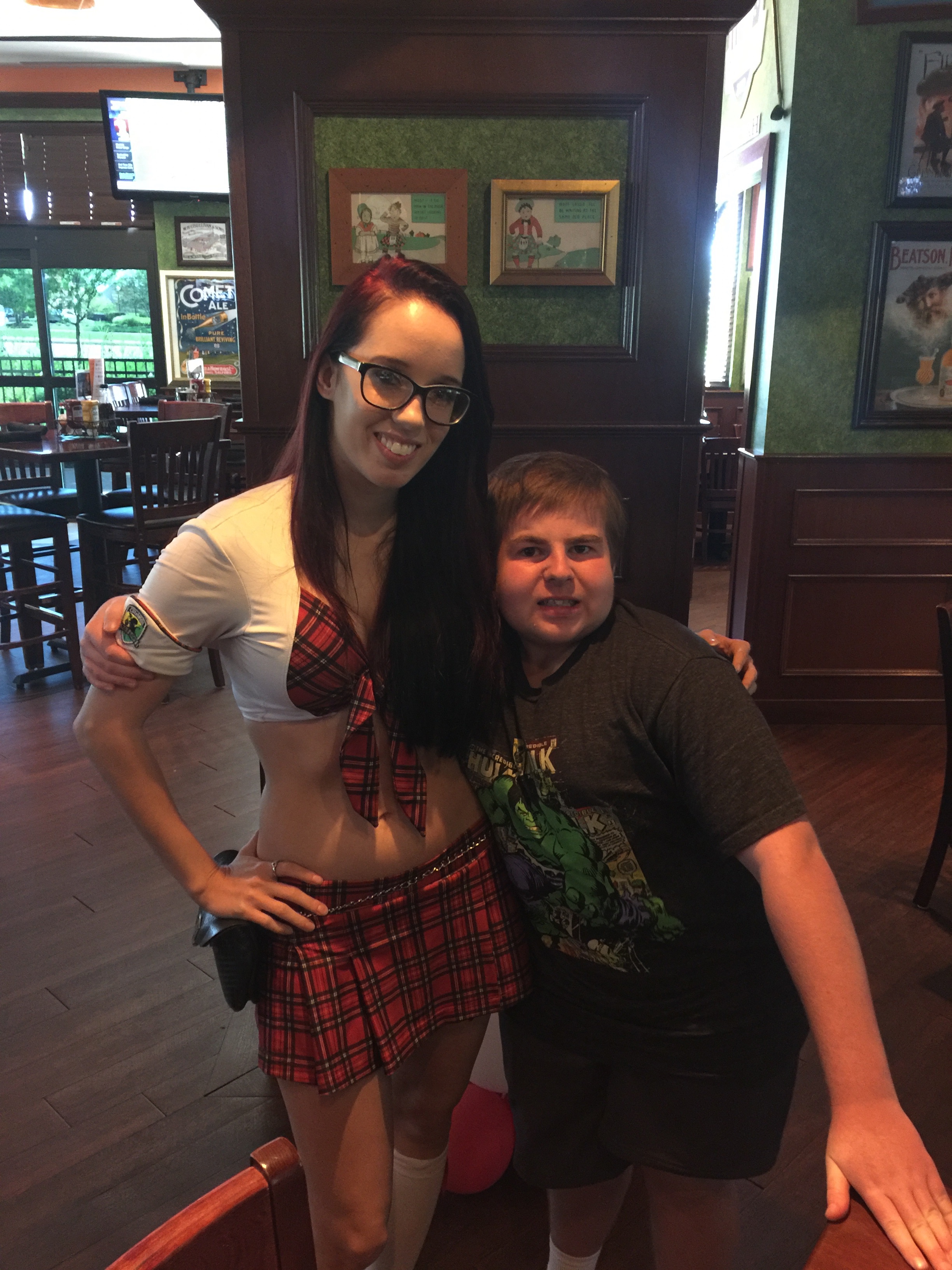 Any concerns I had were quickly put to rest. When Randy saw those girls, he lit up and became the biggest flirt you’d ever seen lol. And they loved him. They weren’t really busy at that time of day, so they all came out and talked to him and laughed at his jokes. Randy was in full flirt mode! Lol He really did love every minute of it. And they thought he was adorable. They asked if he wanted his picture taken with all of them and of course he said yes. Our server also took a pic with him (see below). In those pics, he had the biggest, most genuine smile he had had all day. Randy may have looked like a child, but that day, he reminded me that he was still a man….